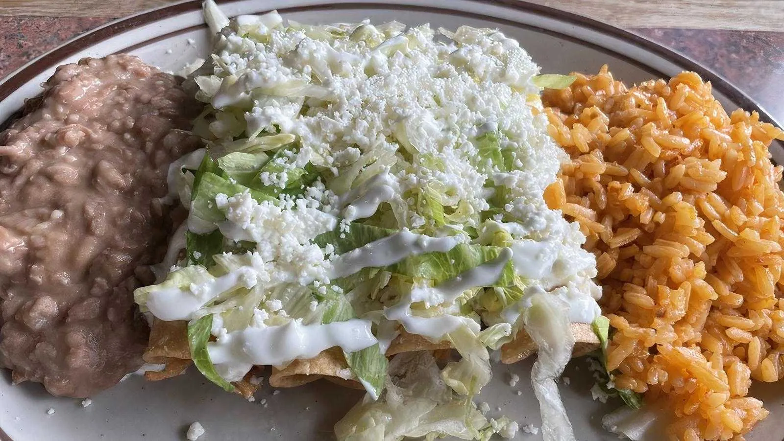 1 Chicken/Green Salsa, 1 Carnitas/Red Salsa, 1 Ground Beef/Cheese Sauce. With Rice, Beans, Lettuce, Quest Fresco And Sour Cream