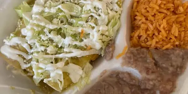 3 Chicken Or Carnitas Enchiladas Covered With Creamy Poblano Salsa Topped With Lettuce, Sour Cream, Queso Fresco, Rice And Refried Or Black Beans.