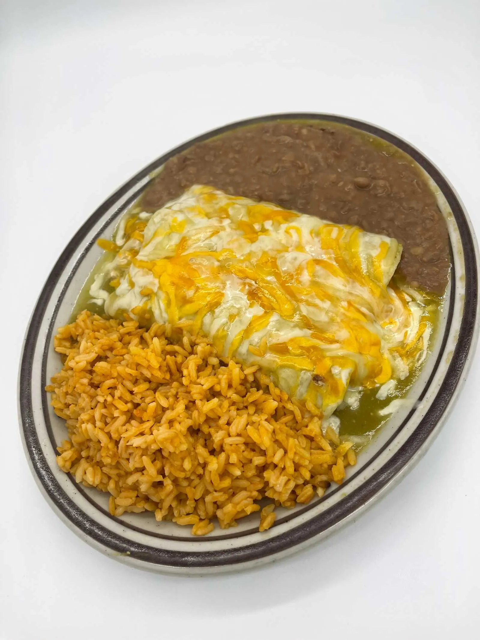 Rice, Mexican Blend Cheese, Your Choice Of Meat, Wrapped In Flour Tortilla, Topped With Guacamole, Pico De Gallo, Sour Cream Cheese And Side Of Refried Or Black Beans.