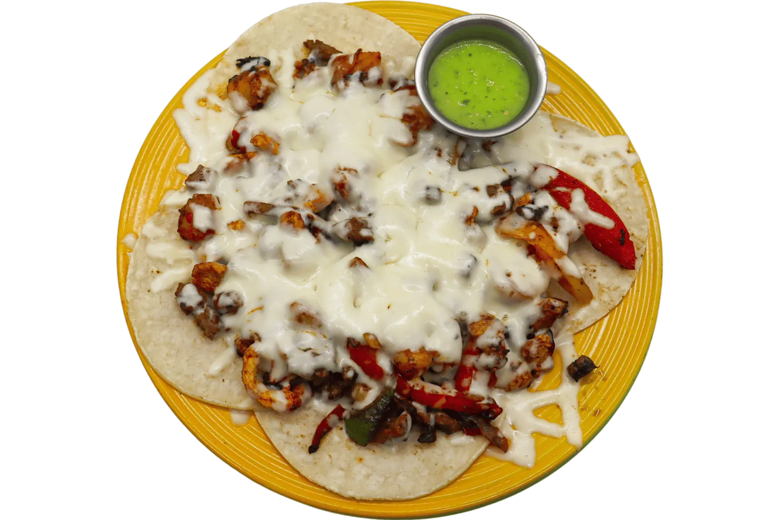 Carne Asada, Chicken, Shrimp, Chorizo, Carne Al Pastor, Queso Fresco, Fried Cactus, Fried Onion, Served With 6 Tortillas, Salsa, Guacamole, Sour Cream And Pico De Gallo.