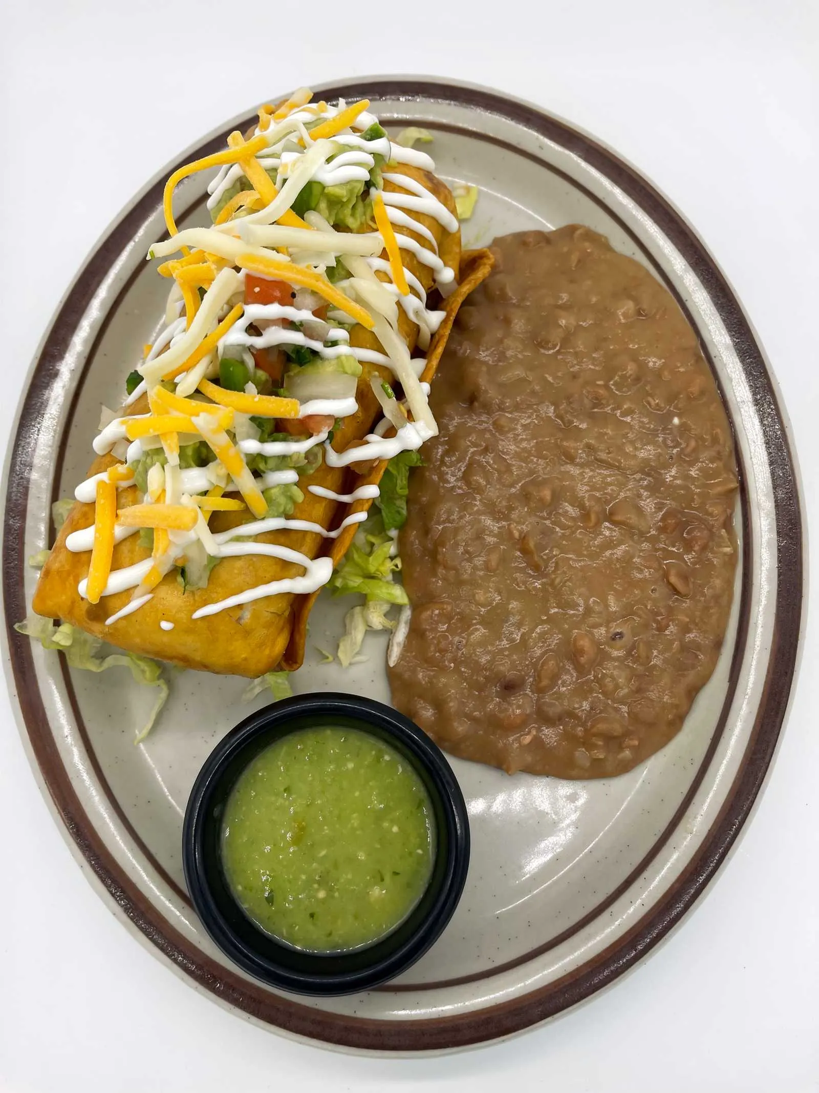 Flour Flautas With Chicken, Topped With Lettuce, Sour Cream, Salsa And Cheese.